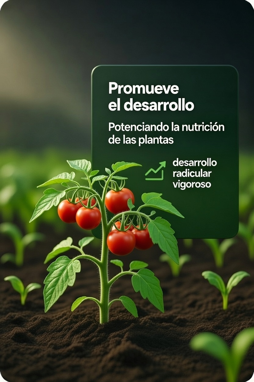 Además, fortalece la resistencia de las plantas, ayudándolas a enfrentar plagas, estrés hídrico y enfermedades. Mejora la calidad del fruto, promoviendo mayor tamaño, mejor sabor y una mejor conservación postcosecha.